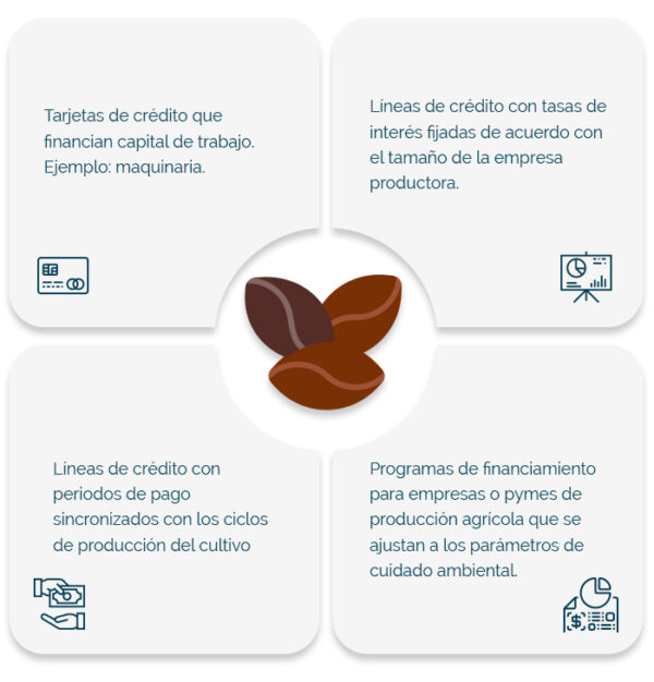 Sin embargo, para las pymes cafeteras hay otro tipo de productos financieros, ofrecidas por las entidades bancarias, que de igual manera pueden contribuir a su desarrollo dentro del rubro del café. Algunas de estas son: